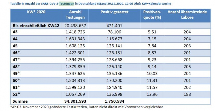 S. obige Tabelle. In der letzten vom RKI erfassten Kalenderwoche, KW 52 (21. - 27.12.2020), wurden über 1 Million Tests durchgeführt. Diese "niedrige" Zahl hängt mit ziemlicher Sicherheit mit den Festtagen zusammen. Eine Woche vorher, in KW51, wurden fast 1,6 Mio. Tests durchgeführt, das ist der Jahresrekord (bis jetzt, denn es fehlt noch KW53).