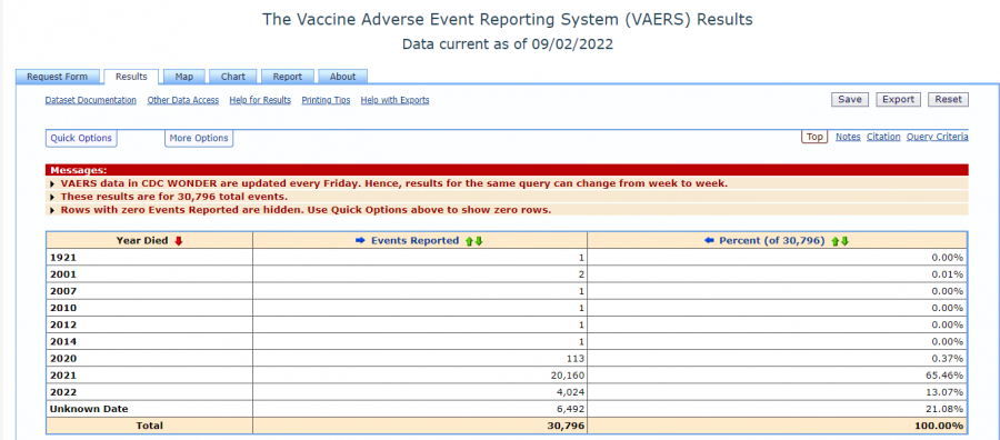 30.796 Todesfälle wurden vom 19.12.2020 bis zum 02.09.2022 nach einer Covid-19-Impfung registriert (s. Screenshot oben).