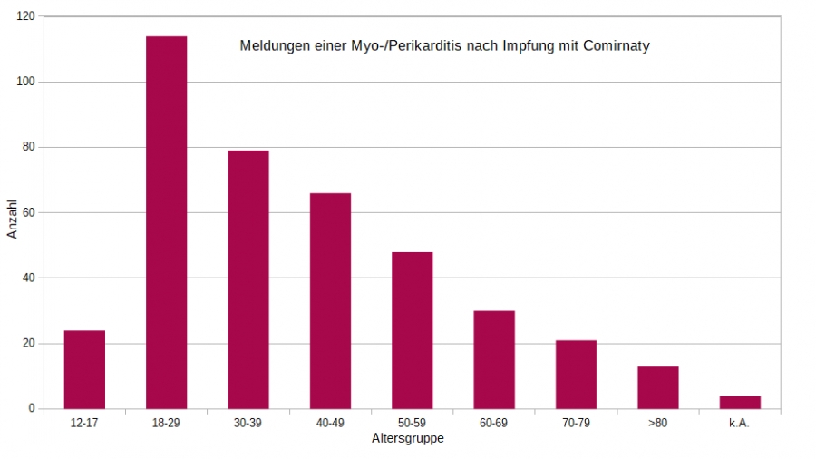 Bei den 70 Fällen mit lebensbedrohlichen Reaktionen (Todesfälle nicht mitgezählt) der 12 - 17-Jährigen ist die häufigste Reaktion die Myokarditis (15 Fälle). Auch andere schwerwiegende Erkrankungen des Herzens finden sich – Herzstillstand (2), Myokardinfarkt (2), Atrio-ventrikulärer Block (1), Perikarditis (2), Perikarderguss (2), Tachykardie (1) und Bradykardie (2).