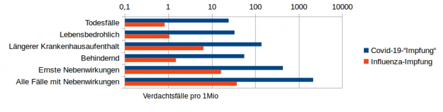 Aktualisiert am 20.9.2021. Duplikate in den Influenza-Impfschäden wurden identifiziert, dadurch stieg der Faktor der Todesfälle von ursprünglich 30 auf 40
