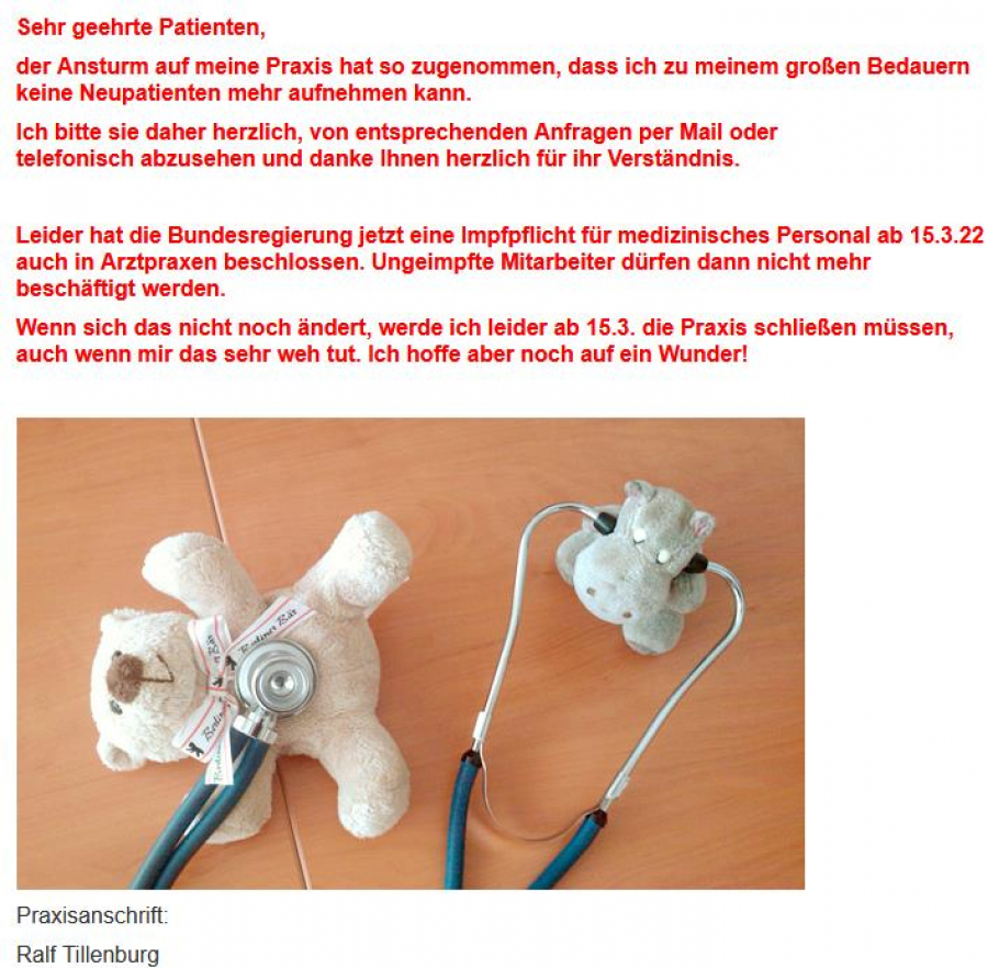 - Dr. Ralf Tillenburg wird, sollte die Impflicht für das medizinische Personal bis dahin nicht abgewendet sein, seine Praxis am 15.03.2022 schließen (s. Titelbild). Auf seiner Website richtet der Arzt folgende Worte an seine Patienten: