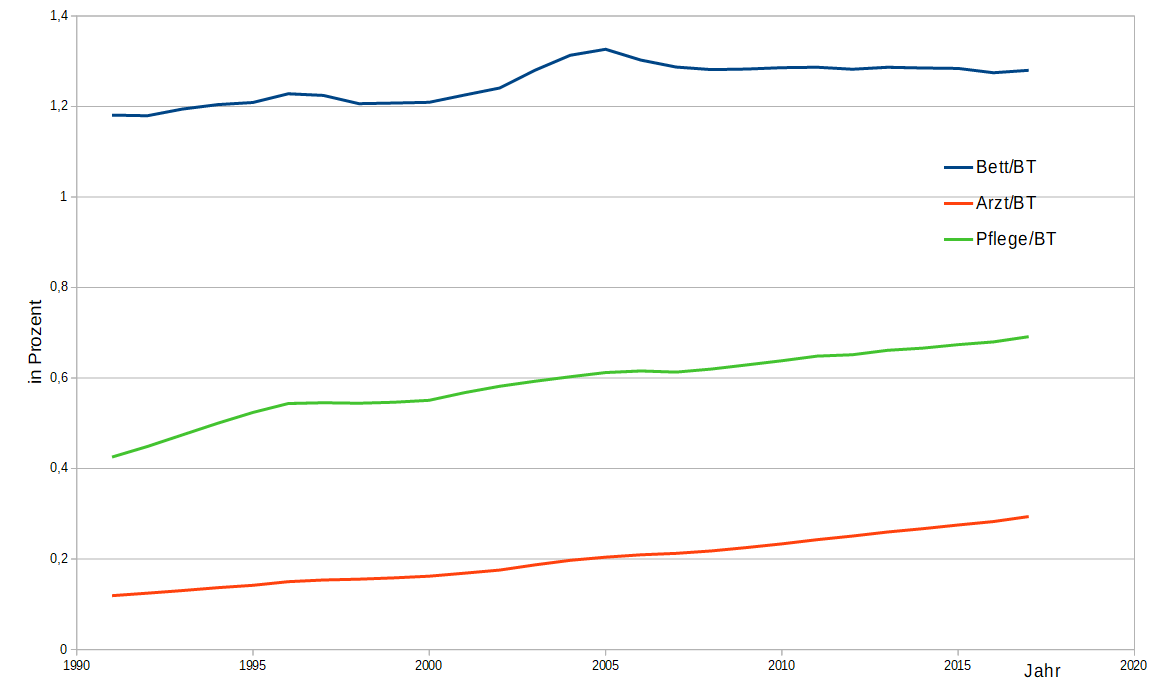 Legt man die zur Verfügung stehenden Ärzte, das Pflegepersonal und die Betten auf die einzelnen Belegungstage (BT) um, so erhält man das unten stehende Diagramm. Dargestellt ist, wieviel Krankenhauspersonal bzw. Betten auf einen Patienten pro Tag entfallen, bezogen auf den Zeitraum 1991 - 2017. Hier zeigt sich, dass sich die Situation nicht unbedingt schlecht entwickelt hat. Insgesamt stehen heute mehr Ärzte, mehr Pflegepersonal und auch mehr Betten zur Verfügung als vor 26 Jahren. Allerdings sagt diese Grafik nichts über die Verteilung der Ressourcen aus. So kümmern sich im Operationssaal mehrere Ärzte und Pfleger um einen einzelnen Patienten -- steigt also der Anteil der intensiven Versorgung, kann es trotzdem bei der Betreuung auf der Station schlechter aussehen.